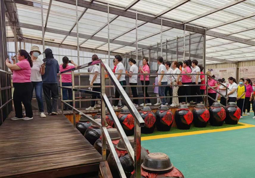 ? ? ? ?到達環(huán)球釀造廠后,職工們首先來到環(huán)球釀造廠園區(qū)內(nèi),在工作人員的講解下參觀了解了古法醬油、醋的制作工藝,零距離接觸翻曬醬油的古法醬園,感受兩千五百噸的日曬醋海,領(lǐng)略中華傳統(tǒng)美食文化釀造流程,探究醬醋文化的起源和工藝。活動中,大家還品嘗到了日曬五糧窖香醋、原汁日曬濁醬油、甜面醬,紛紛表示意猶未盡。