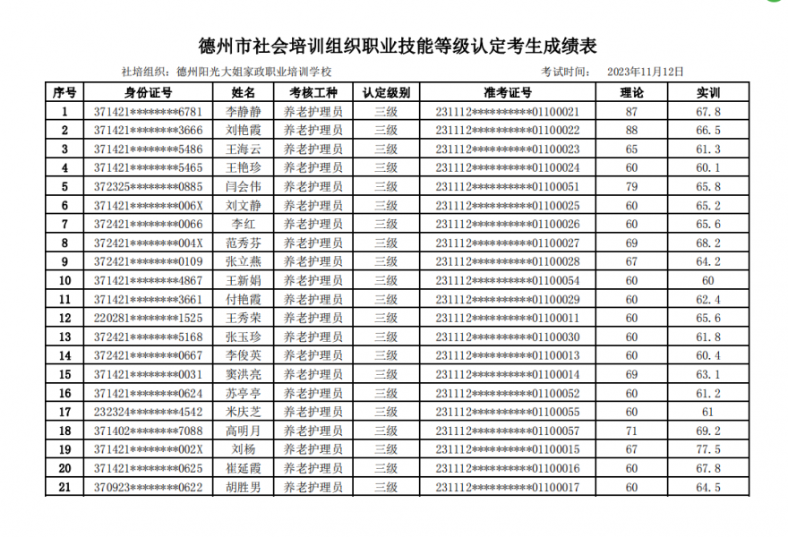 根據(jù)《山東省技能人才社會(huì)培訓(xùn)組織評(píng)價(jià)考核工作規(guī)則》規(guī)定和要求 ,通過考核,現(xiàn)將我校20231112期社會(huì)職業(yè)技能等級(jí)認(rèn)定成績(jī)予以公示,接受社會(huì)監(jiān)督。公示期5日,自2023年11月17日至2023年11月23日。公示期間如有異議,請(qǐng)撥打監(jiān)督電話0534-2258869。