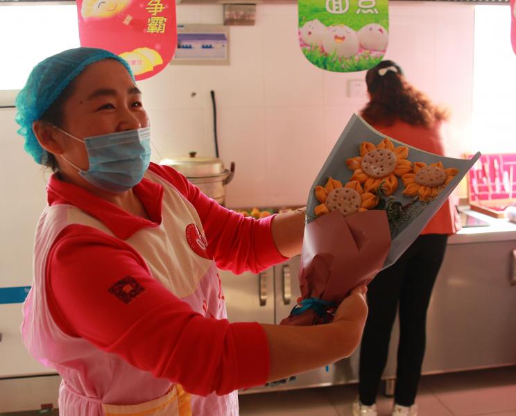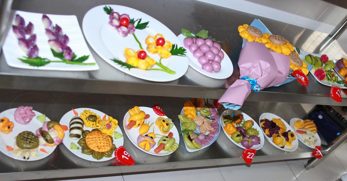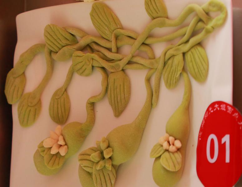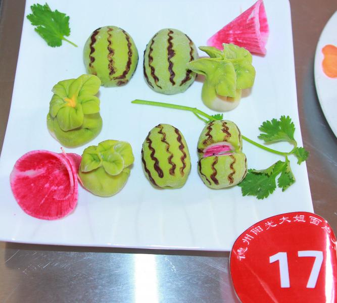比賽一開始,大姐們就立即投入制作,揉面、剁餡……每一道工序有條不紊進(jìn)行。制作過程中她們一絲不茍,耐心細(xì)致,將一份份精致誘人、創(chuàng)意新穎、美味的面點(diǎn)呈獻(xiàn)在大家面前,有含苞待放的玫瑰卷、軟糯香甜的紫薯卷、惟妙惟肖的小豬、風(fēng)味獨(dú)特的披薩、外焦里嫩的紅豆餅、色香俱全的蒸餃、形象逼真的紅辣椒、茄子、西瓜……大姐們用嫻熟精湛的制作手法做出了一道道令人垂涎欲滴的美味面點(diǎn),小小的面團(tuán)在她們手里百般變化,化成一道道舌尖的美味。令在座的評(píng)委老師們老師們贊嘆不已!