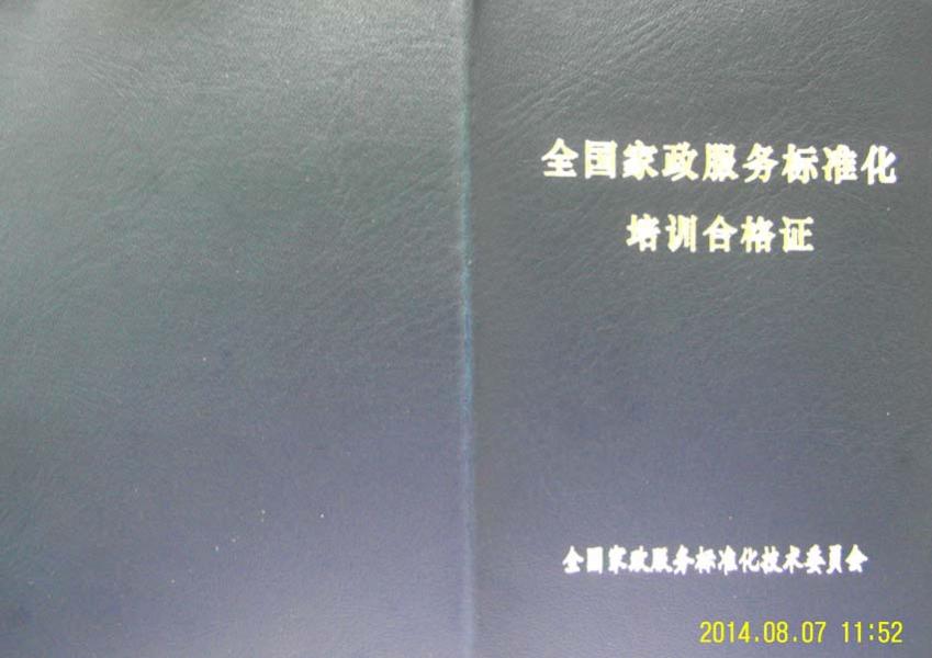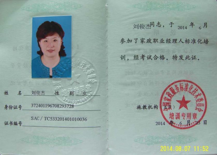 祝賀公司劉俊杰經(jīng)理獲得全國(guó)家政服務(wù)標(biāo)準(zhǔn)化技術(shù)委員會(huì)頒發(fā)的首批經(jīng)理人標(biāo)準(zhǔn)化培訓(xùn)班合格證書