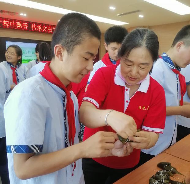 ? ? ? ? 通過老師的講解,孩子們不僅知道了端午節(jié)的來歷和屈原忠君愛國(guó)的故事,還了解了各地區(qū)過端午的不同風(fēng)俗,懂得了吃粽子、做香囊、賽龍舟、懸掛艾葉、撞鴨蛋等習(xí)俗背后承載的文化內(nèi)涵。陽光大姐家政人員演示了粽子的制作過程,“拿兩片粽葉,折成漏斗的形狀,先在底下平鋪一層糯米,再放上棗和花生,包完要綁線,先綁頭,一定要緊緊繞幾圈,這樣米才不會(huì)散出來”。家政人員邊包著粽子,邊教著同學(xué)們,同學(xué)們熱情高漲,專注投入,折粽葉、裝米、定型、綁線。經(jīng)過一個(gè)小時(shí)的努力,許多同學(xué)學(xué)會(huì)了包粽子。在包粽子的整個(gè)活動(dòng)過程始終充滿歡聲笑語,同學(xué)們盡情享受著包粽子帶來的樂趣和成果,感受著中國(guó)傳統(tǒng)節(jié)日的獨(dú)特魅力。